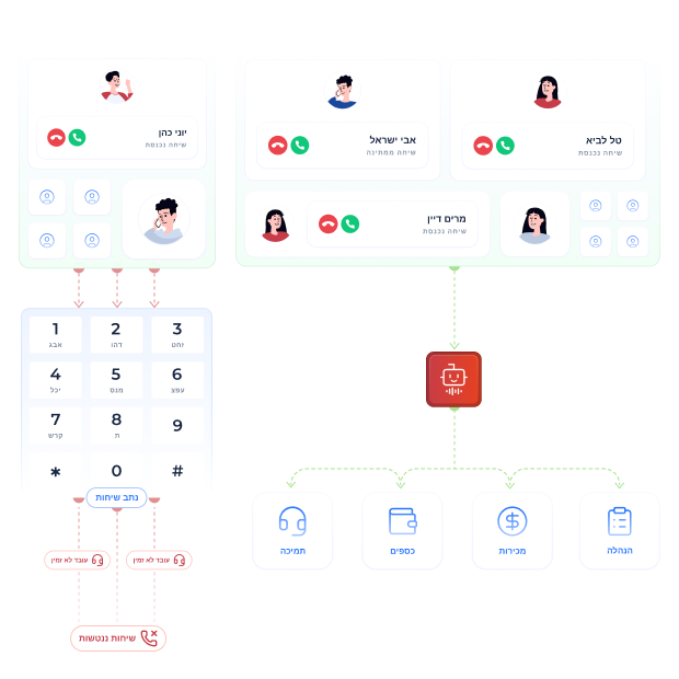 VoiceBot Center is not an "upgraded IVR" - it's a complete platform for creating virtual agents (AI Voice Agents) that handle all types of business tasks. The platform enables building voicebots that specialize in organizational tasks, such as: a virtual reception agent that handles general inquiries, an agent that schedules appointments or technician visits, a service agent that handles complaints and solves technical problems, a sales agent that takes orders, and even an assertive sales agent that makes outbound calls and warms up potential leads. These are just a short list of countless new capabilities that Voicenter's Voicebot enables you to implement today.